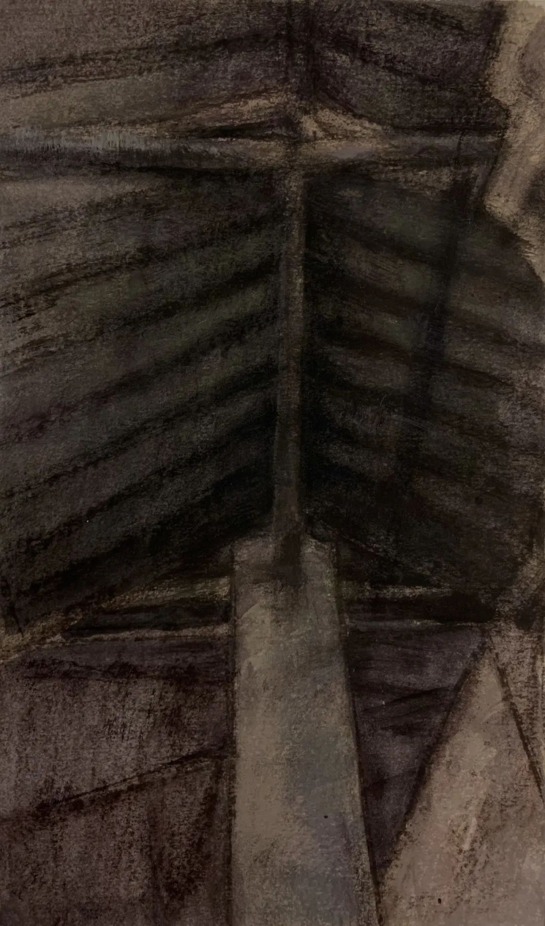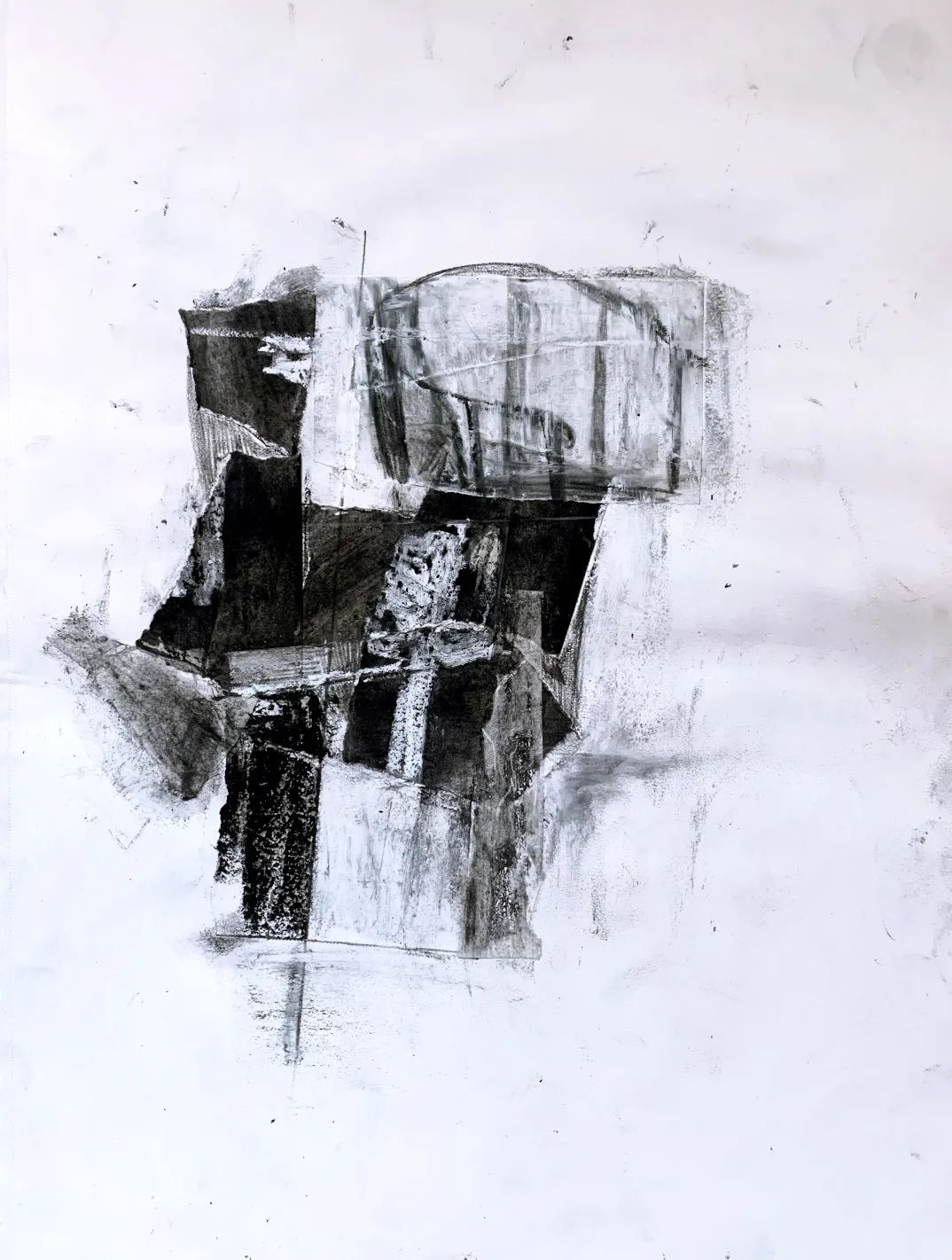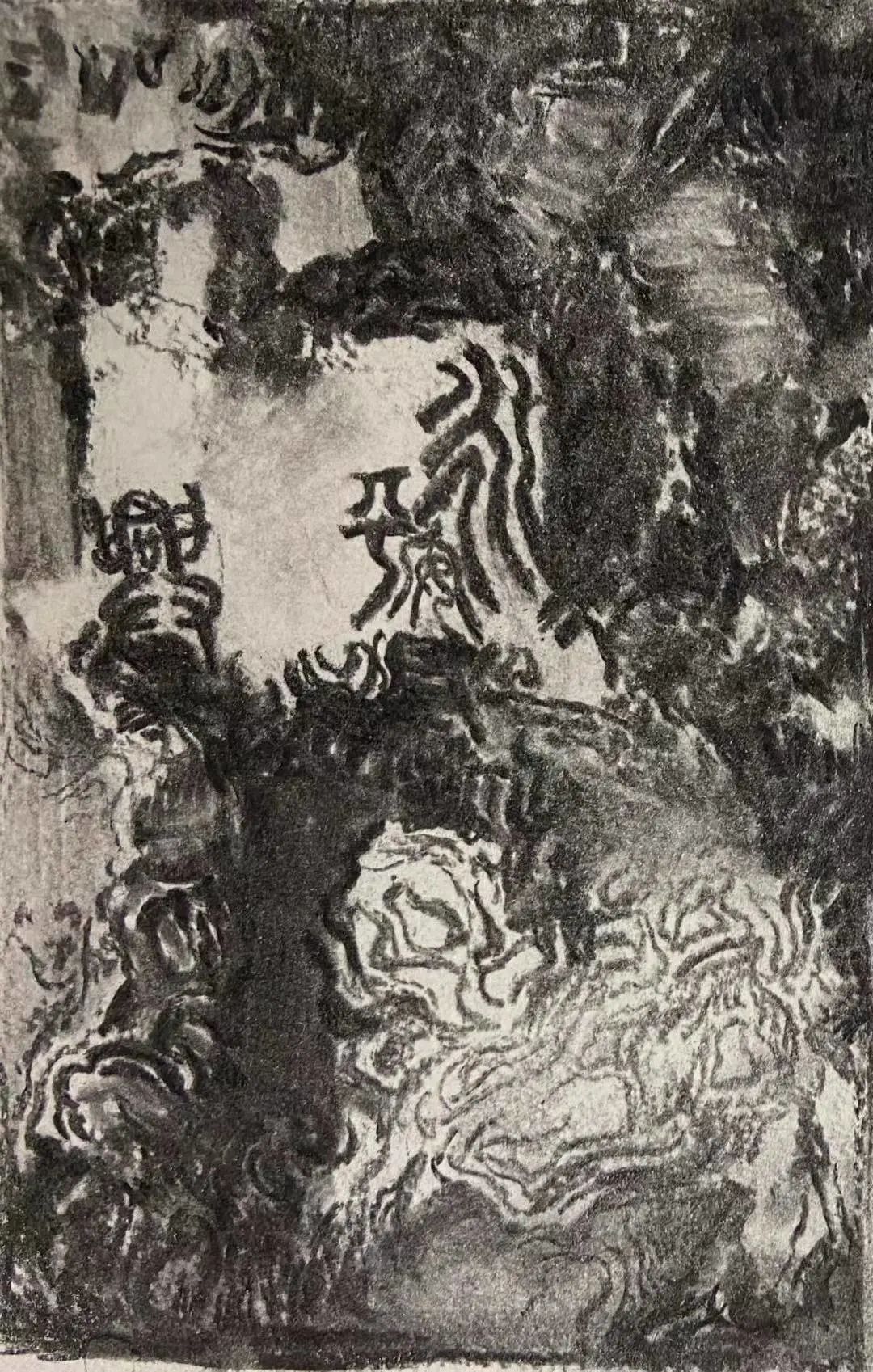 《古生代的石滩里》60x35cm 纸本木碳 2021