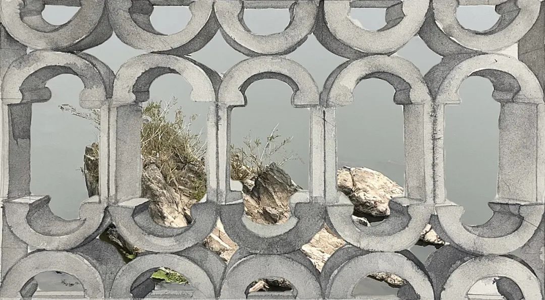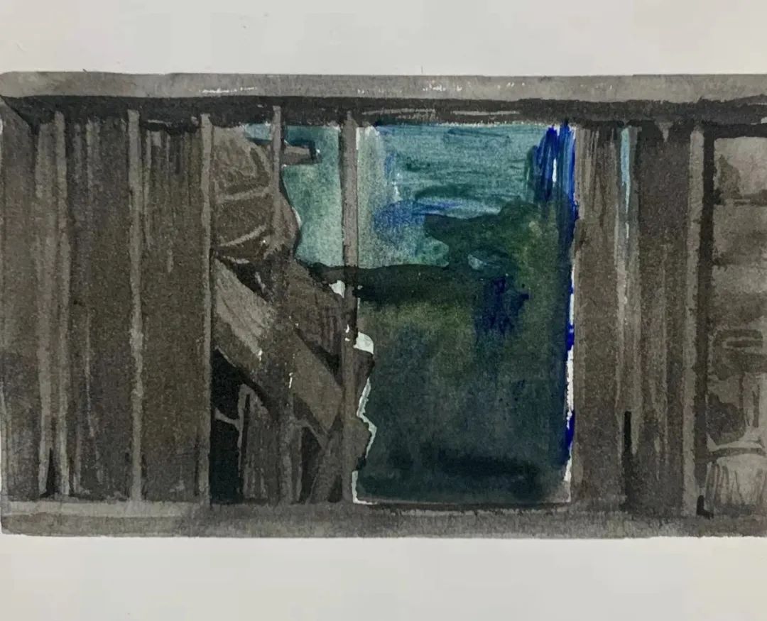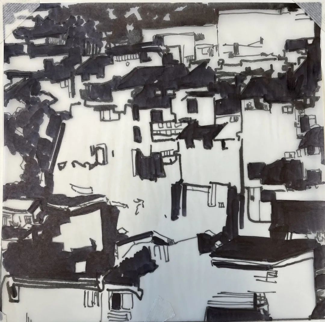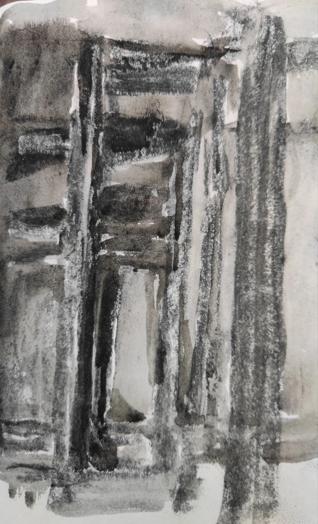 本次课程的小稿与成稿刻画了不同的重点,小稿更偏向于刻画渔村中窗户与门牌的原貌,成稿则偏感性,用淡墨层层叠加,描绘出我感受到的渔梁街的平静,愿这画面能唤起观众尘封的记忆。此外,渔村荒淡的街道中偶有露出地面的废弃水管,这样与周围格格不入的景色吸引我的眼球,着实有趣。
