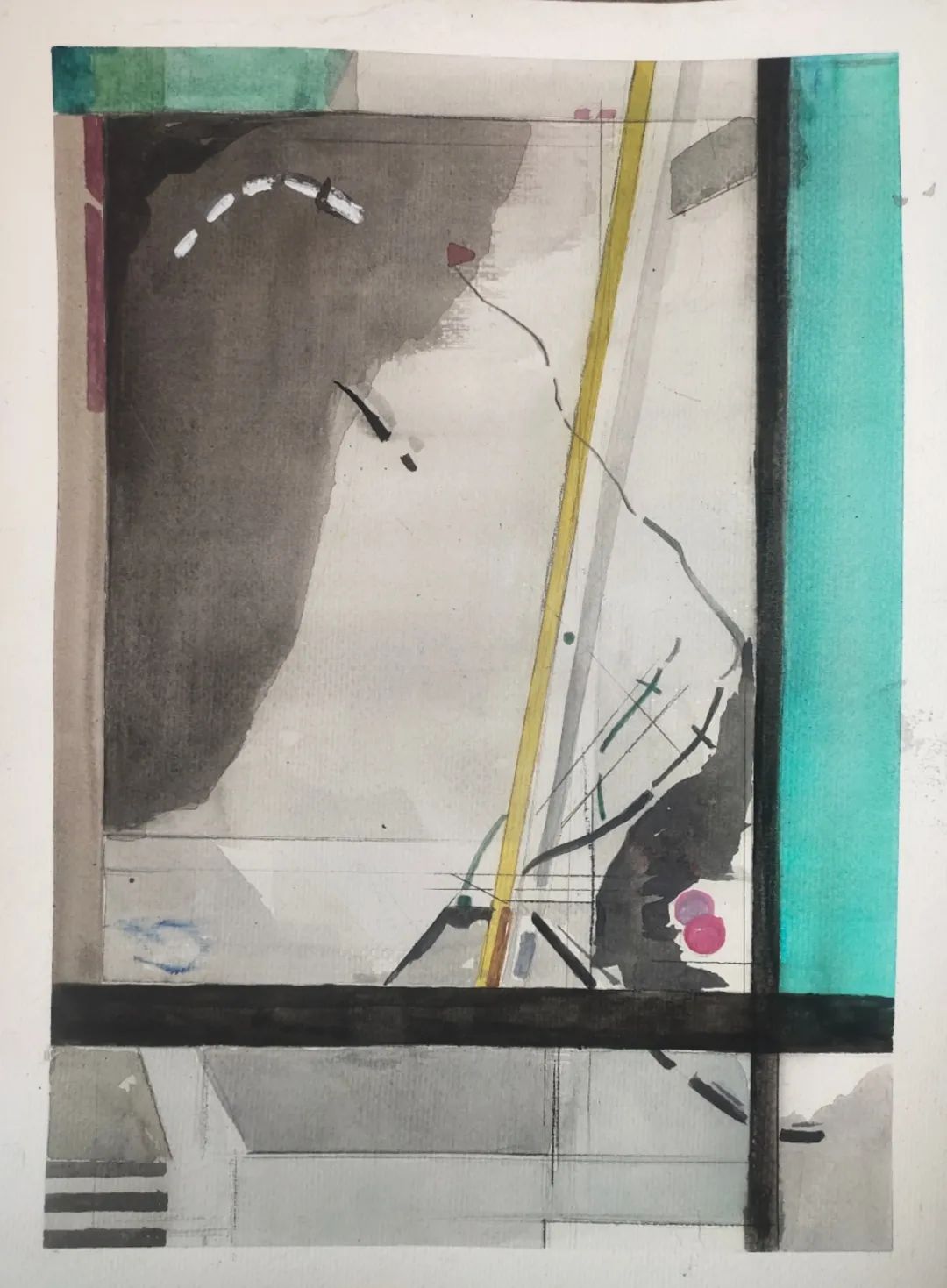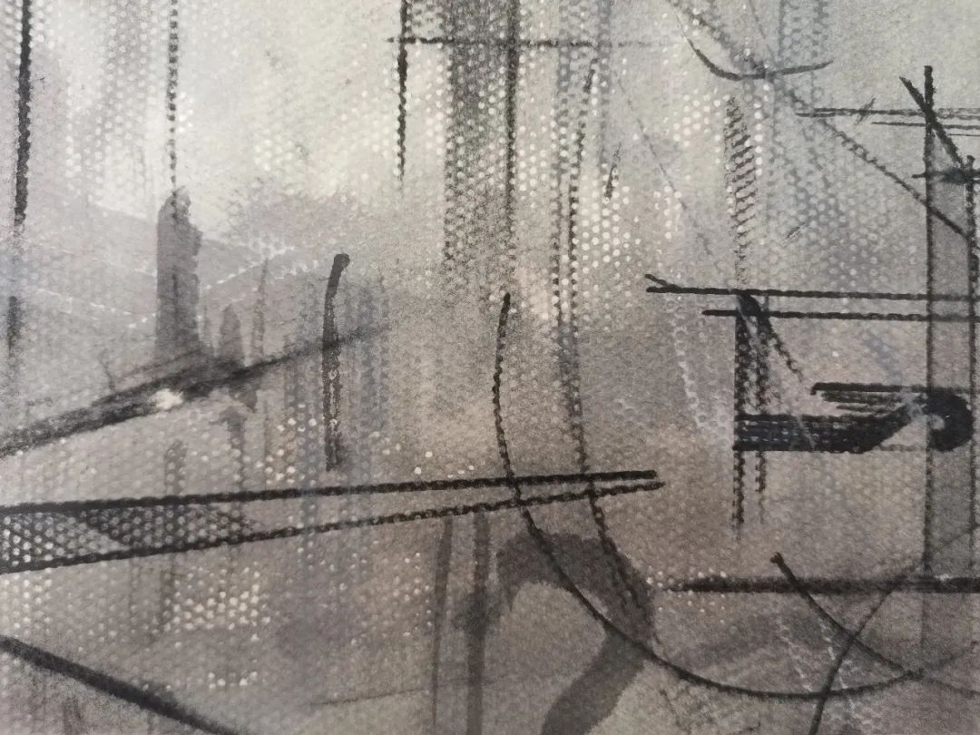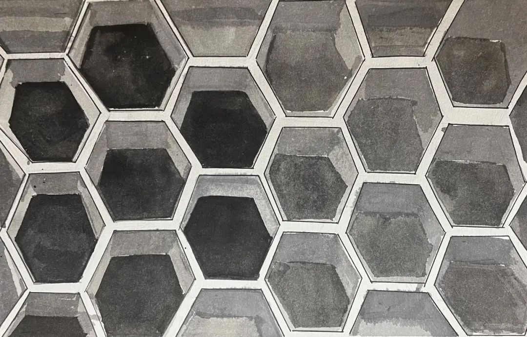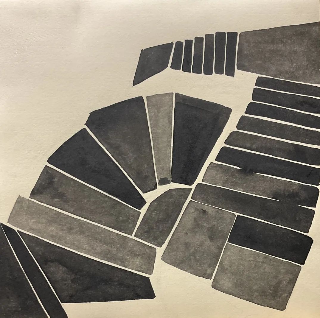 本次课程的小稿与成稿刻画了不同的重点,小稿更偏向于刻画渔村中窗户与门牌的原貌,成稿则偏感性,用淡墨层层叠加,描绘出我感受到的渔梁街的平静,愿这画面能唤起观众尘封的记忆。此外,渔村荒淡的街道中偶有露出地面的废弃水管,这样与周围格格不入的景色吸引我的眼球,着实有趣。