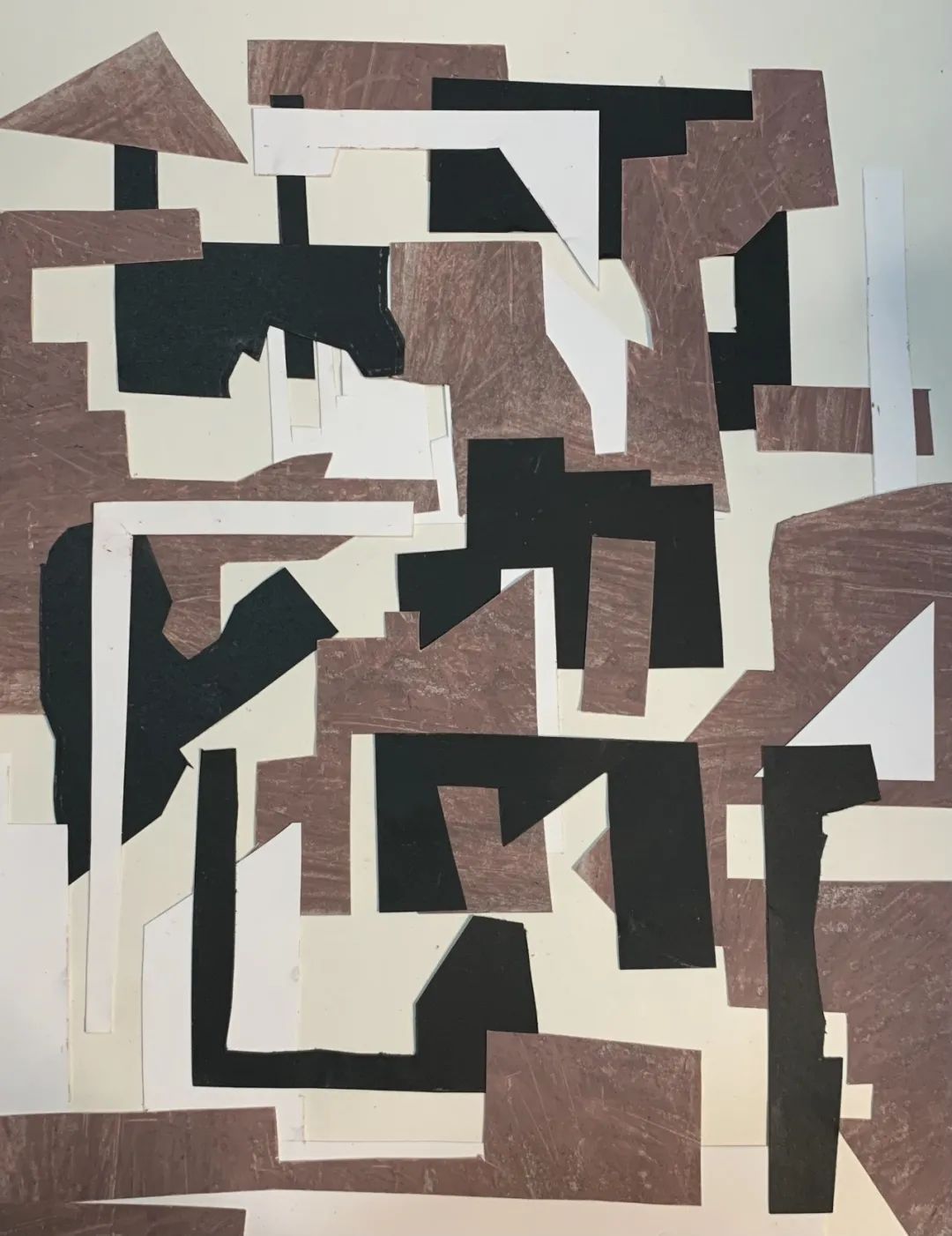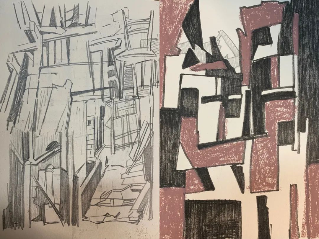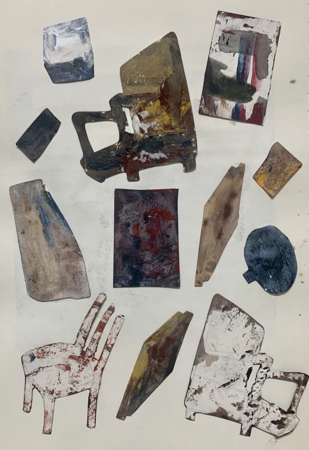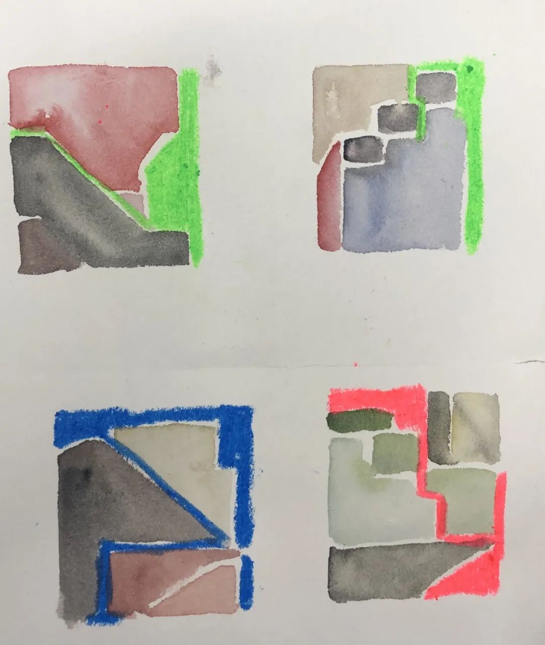 这次下乡是我第一次感受到综合材料创作的自由,也是对自己表达方式的探索,给我印象最深的是黄老师说的“创作在于发掘自我”,把属于自己的情绪表达在画面上,确实,一开始我想学着别人的方法,用平面化的手法平涂色块,但就是画不出感觉,画面总是很平,后来找到了适合自己的、较为外露的一些方式,创作思路陡然开朗很多,我也更加明晰自己想要什么样的画面。在画面和最终题材的选取上,经过多次推翻重来,尝试新方案。最终采用如下两种题材:一是研究明式家具的极简造型,将其解构重组;二是歙县里经雨水冲刷变得斑驳发灰的墙壁。