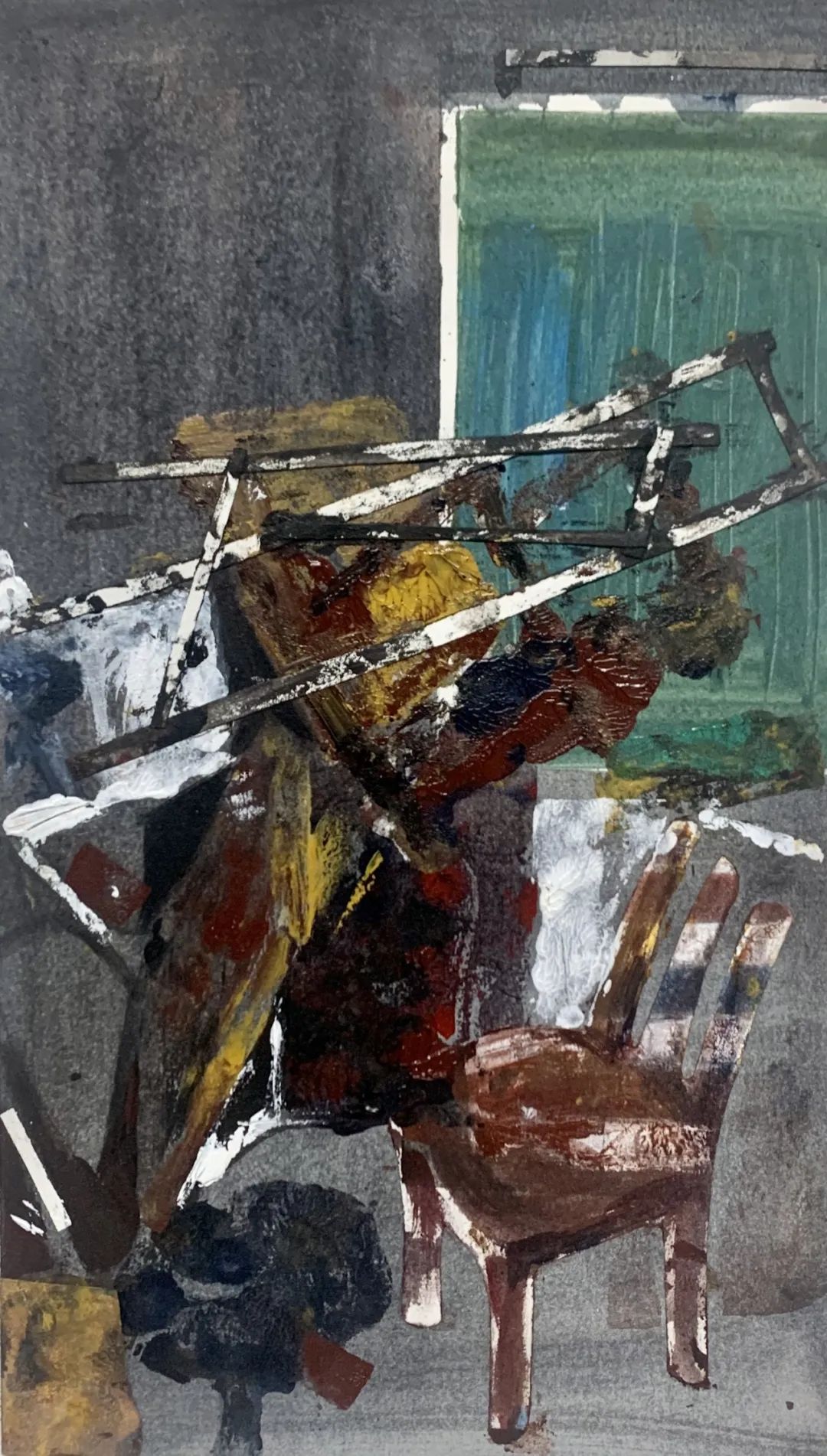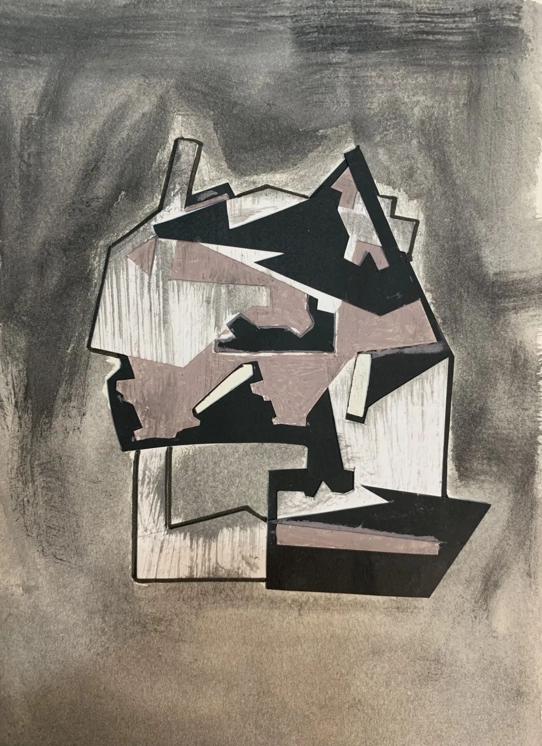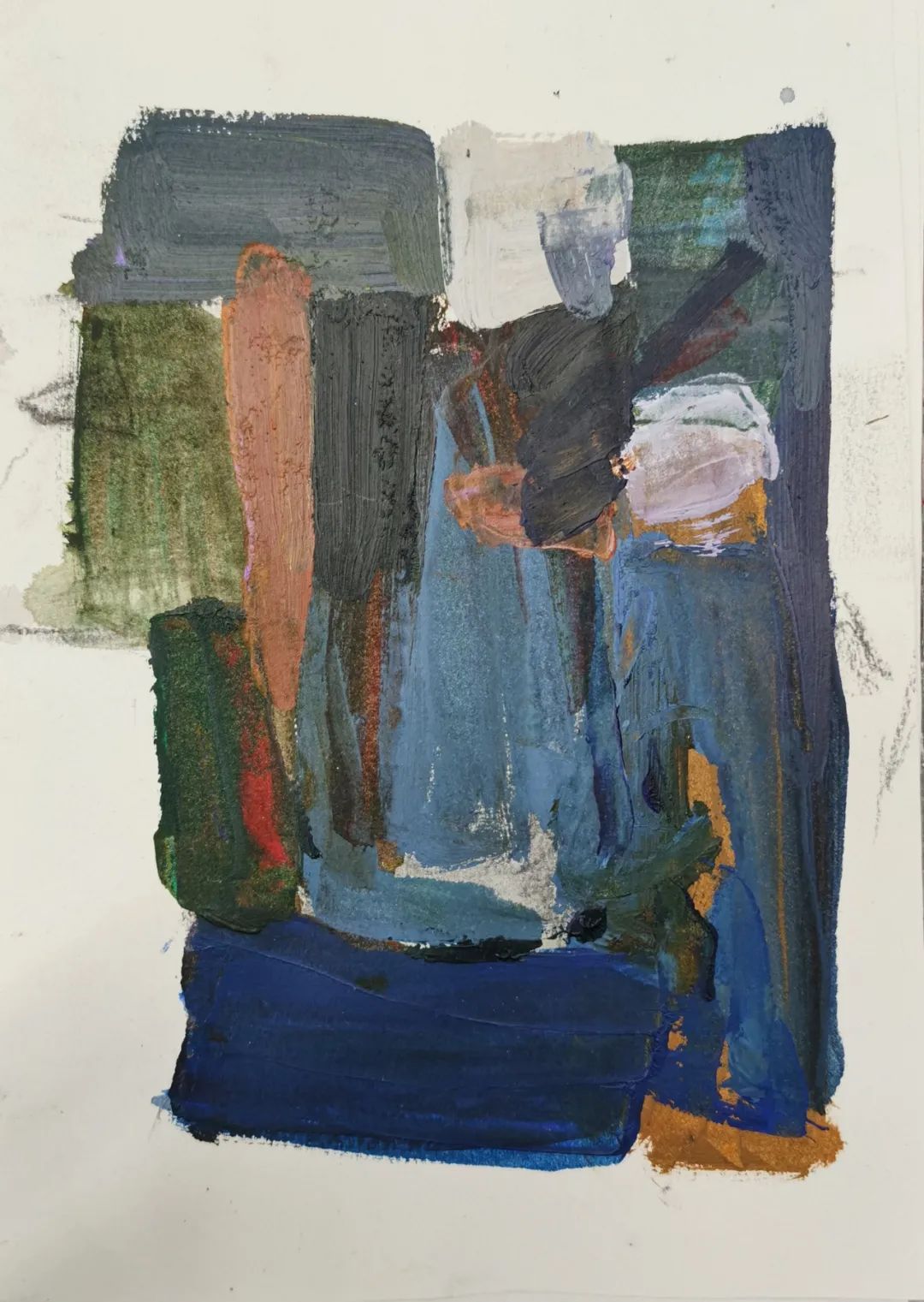 这次下乡是我第一次感受到综合材料创作的自由,也是对自己表达方式的探索,给我印象最深的是黄老师说的“创作在于发掘自我”,把属于自己的情绪表达在画面上,确实,一开始我想学着别人的方法,用平面化的手法平涂色块,但就是画不出感觉,画面总是很平,后来找到了适合自己的、较为外露的一些方式,创作思路陡然开朗很多,我也更加明晰自己想要什么样的画面。在画面和最终题材的选取上,经过多次推翻重来,尝试新方案。最终采用如下两种题材:一是研究明式家具的极简造型,将其解构重组;二是歙县里经雨水冲刷变得斑驳发灰的墙壁。