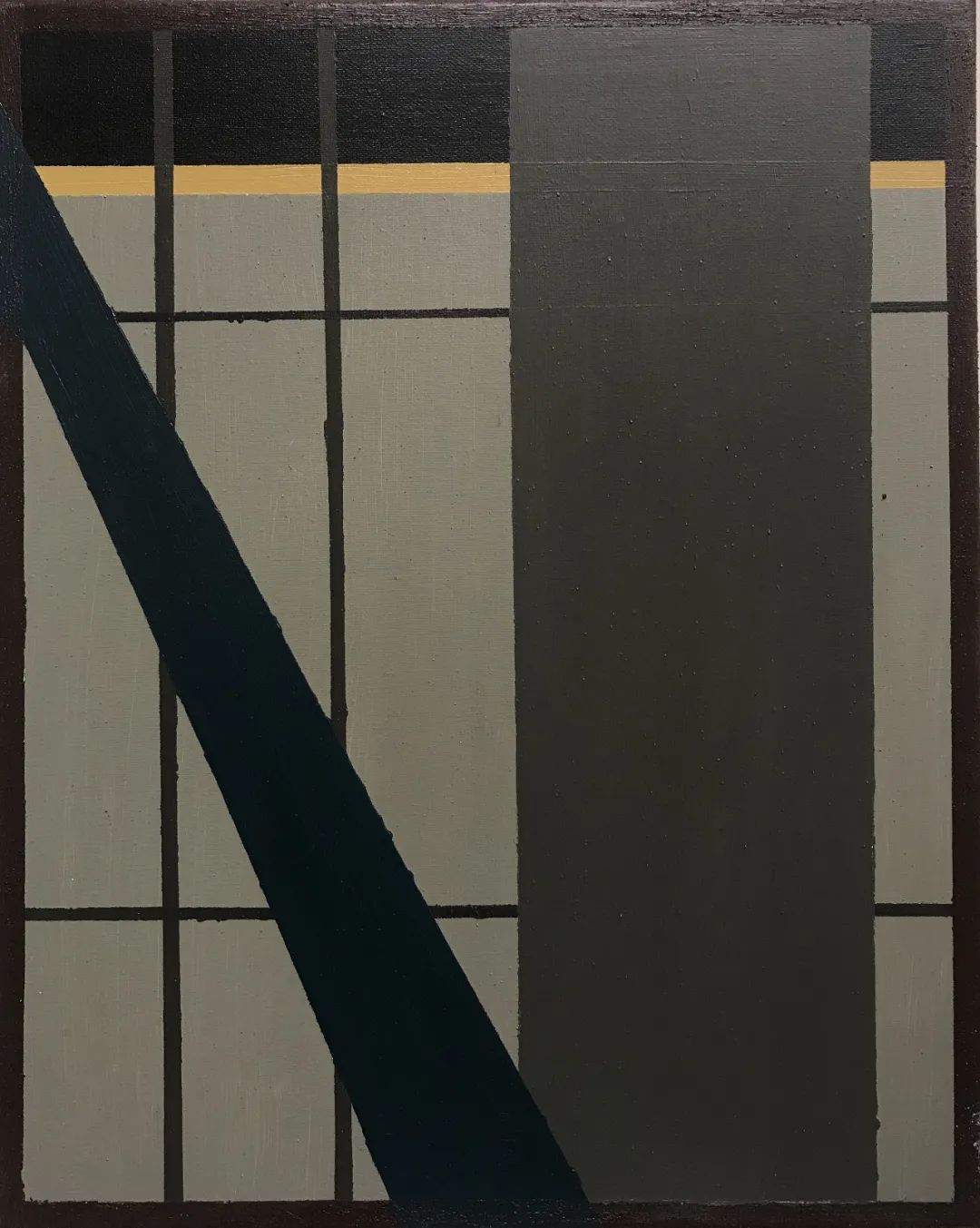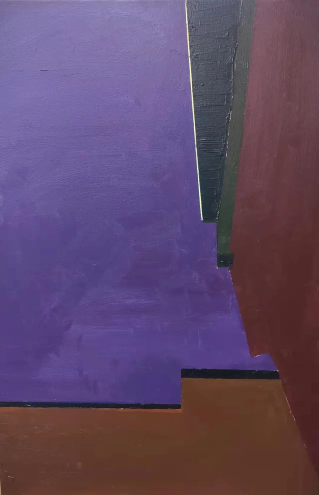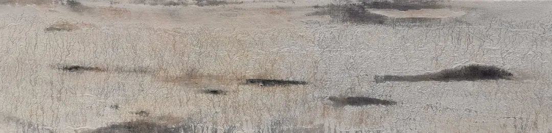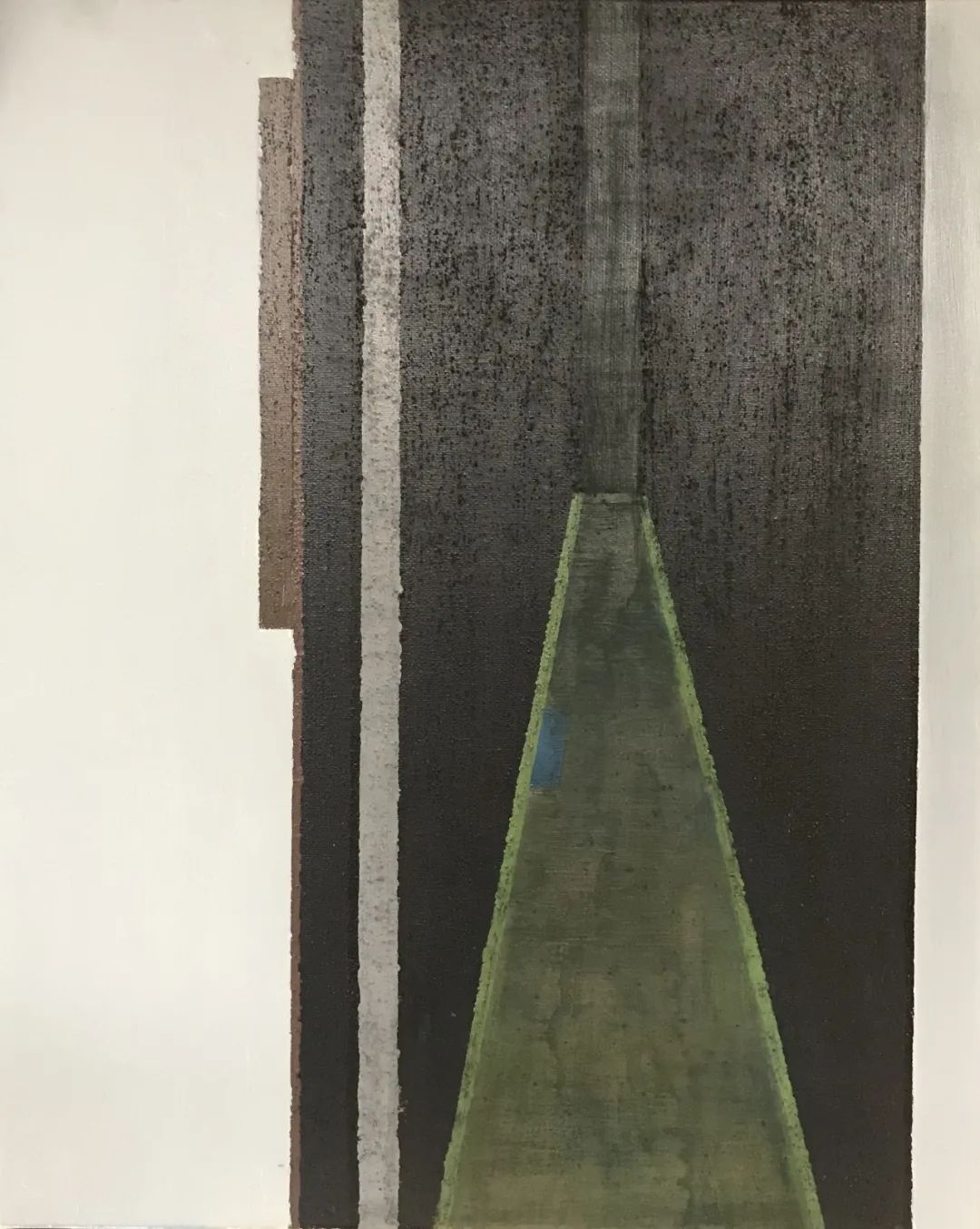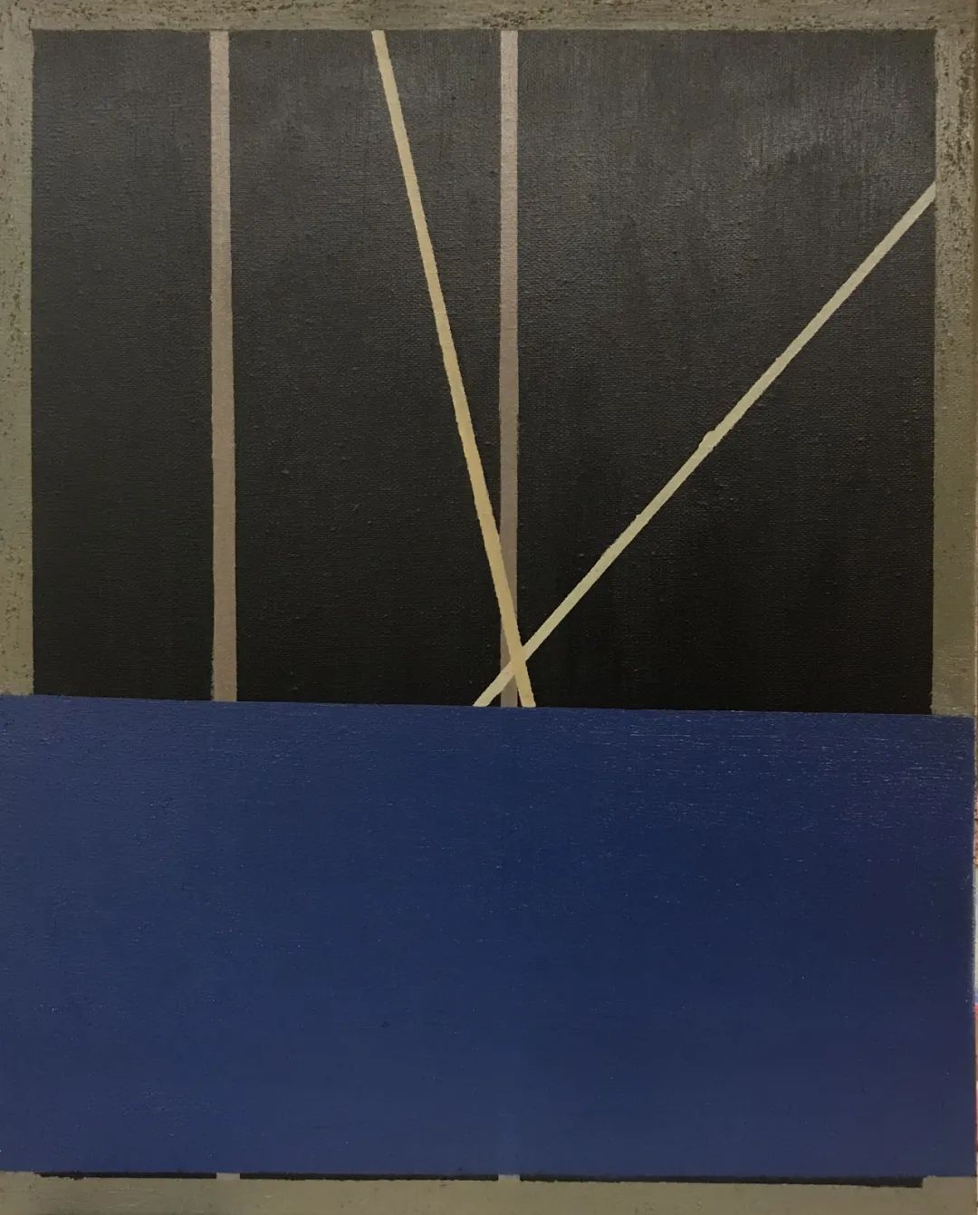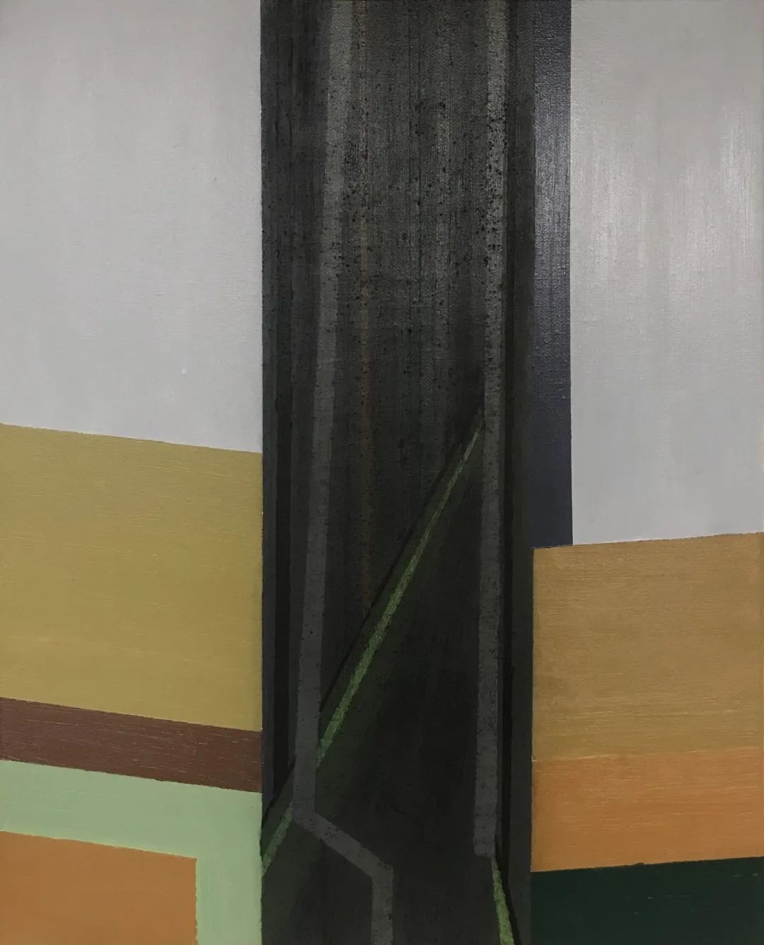 在下乡调研中发现的房屋上的洪水线——人们对洪灾的纪念使我关注到了人与自然之间的辩证关系。起初是描绘具象景观,选择“滩涂”作为切入点——人与水联结的象征。后来再是从此自然景象中提取出抽象印象作为绘画语言,概括、变形、打碎、融合,忽略透视,改变具象对象排列的秩序,用平面堆叠代替三维表现,强调边线,获取破碎形。之后再将画面聚焦于我已获得的纯粹语言。用绘画的感受回答自身提出的问题:“人类生活是否只是滩涂的无限延伸?”