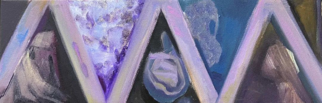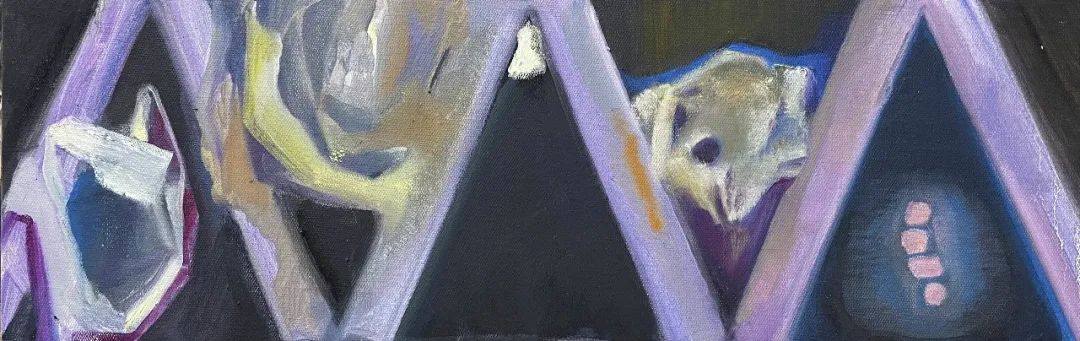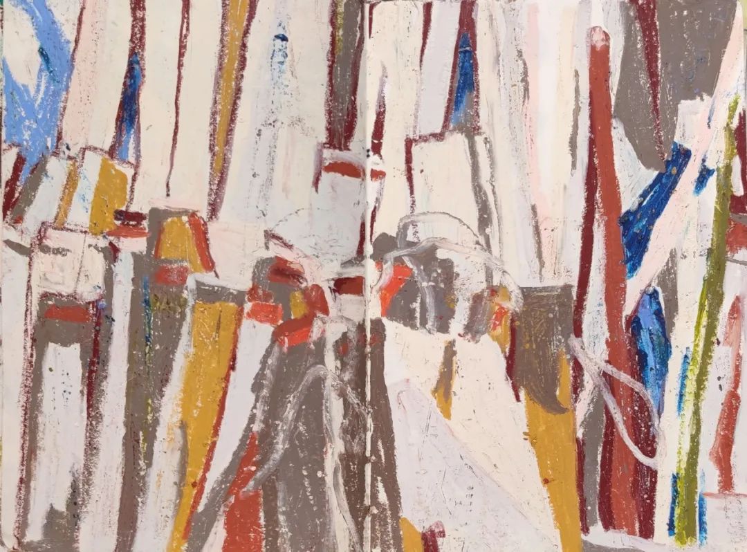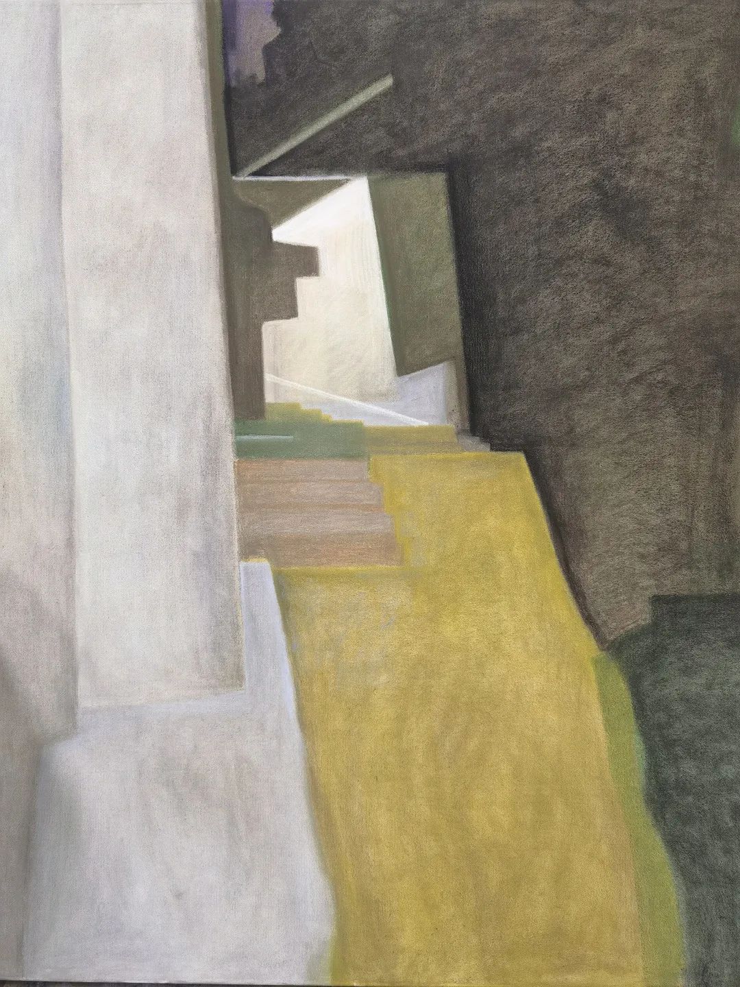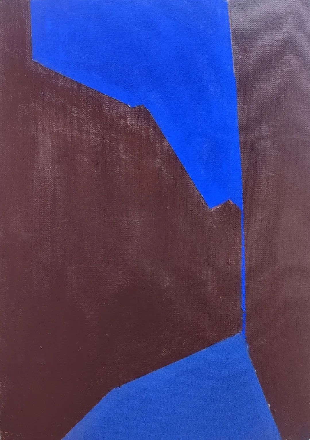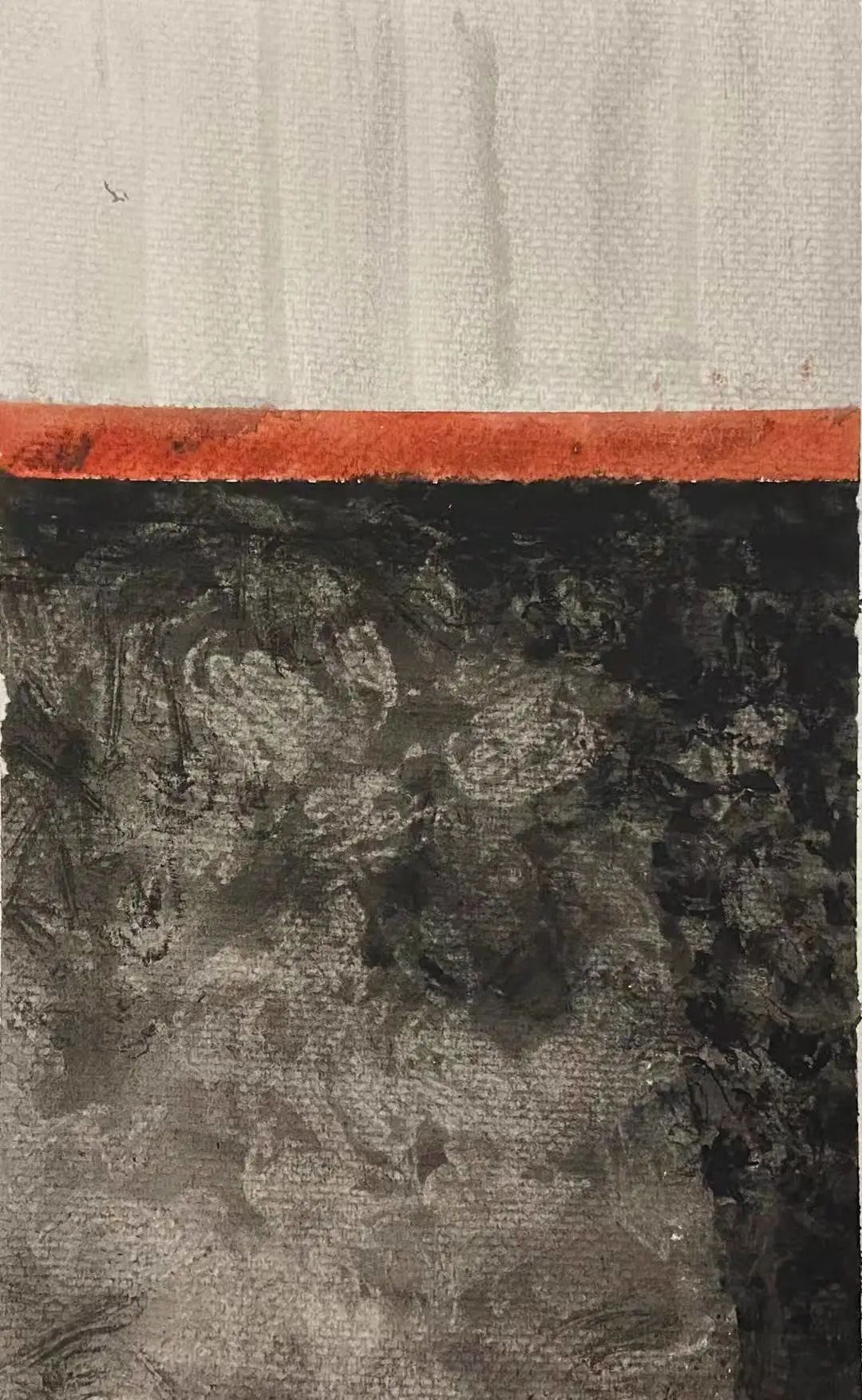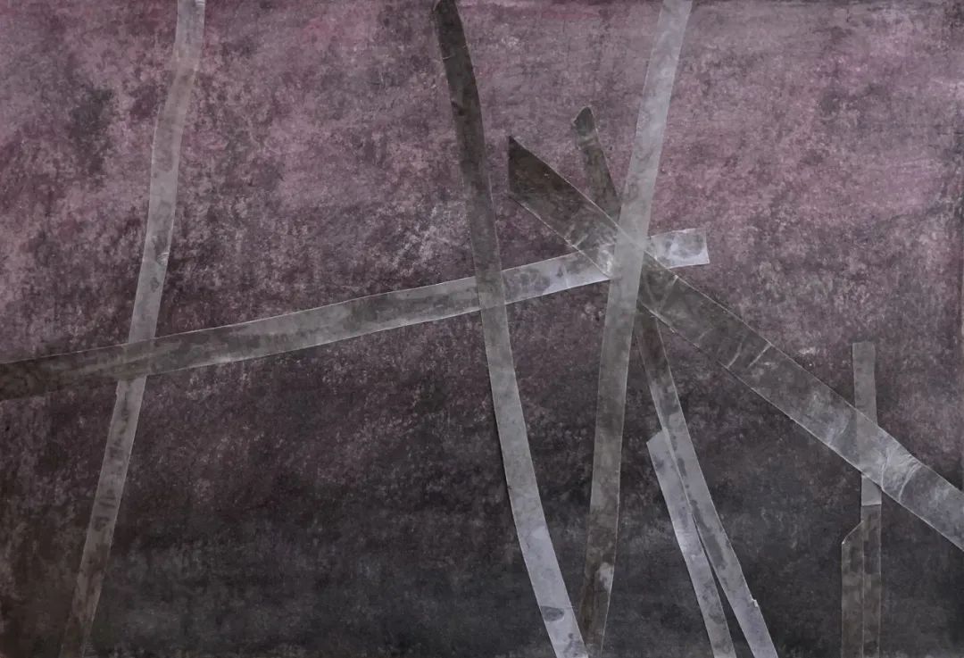 在下乡调研中发现的房屋上的洪水线——人们对洪灾的纪念使我关注到了人与自然之间的辩证关系。起初是描绘具象景观,选择“滩涂”作为切入点——人与水联结的象征。后来再是从此自然景象中提取出抽象印象作为绘画语言,概括、变形、打碎、融合,忽略透视,改变具象对象排列的秩序,用平面堆叠代替三维表现,强调边线,获取破碎形。之后再将画面聚焦于我已获得的纯粹语言。用绘画的感受回答自身提出的问题:“人类生活是否只是滩涂的无限延伸?”