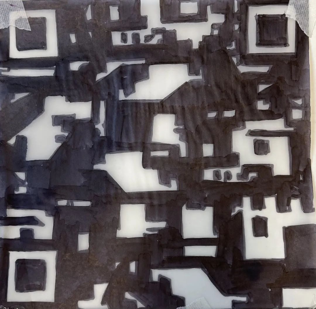 二维码用来储存物像信息,人们通过扫描来获取信息。宏观上看渔梁村的白墙黑瓦,可直接被抽象成二维码,加上人们对于徽派建筑的普遍印象一般是白墙黑瓦。当我把人们对它的这种刻板印象与我下乡所看到的古建筑信息输入我的作品中,人们扫描它时(观看它)就相当于手机扫码。白墙黑瓦隐藏着历史信息,我的作品同时表达了一种古建筑与现代生活方式的对比。